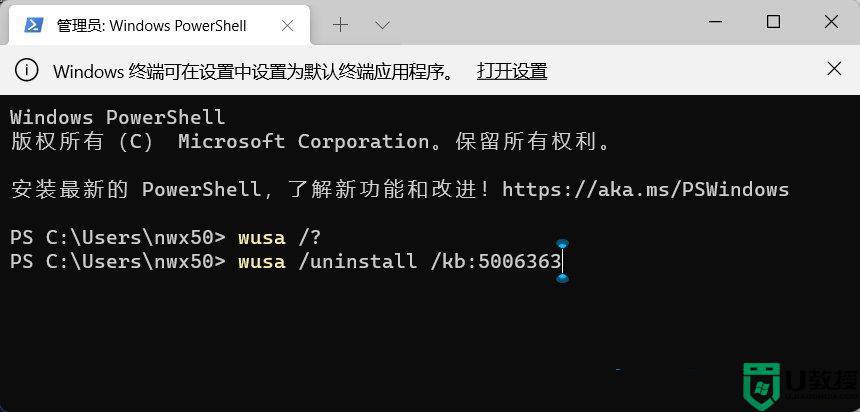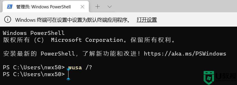 2、管理员: Windows powershell窗口,输入【wusa /?】命令,并按回车;