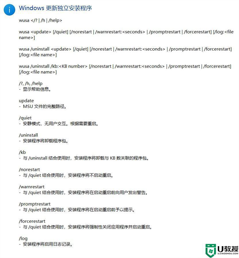 3、这时候,会弹出【Windows 更新独立安装程序】,可以查看本次使用命令【wusa】的帮助信息;