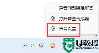 1、右键右下角的声音图标,打开“声音设置”。
