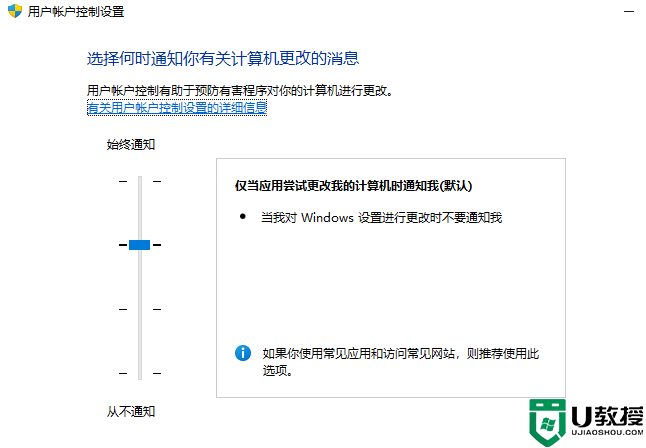 4、用户账户控制设置窗口,可以看到默认的设置是开启了用户账户控制功能;
