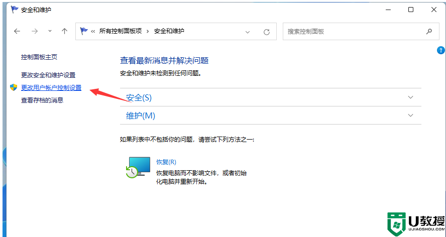 3、安全和维护窗口,左侧点击【更改用户账户控制设置】;