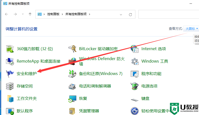 2、所有控制面板项窗口,切换到【大图标】查看方式,然后找到并点击调整计算机的设置下的【安全和维护】;