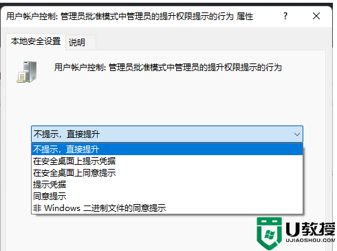 4、用户账户控制:管理员批准模式中管理员的提升权限提示的行为 属性窗口,选择【不提示,直接提升】,然后点击【应用确定】即可。