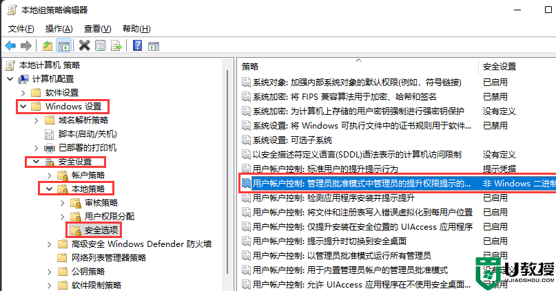 3、本地组策略编辑器窗口,左侧依次展开到【Windows 设置》安全设置》本地策略》安全选项】,右侧找到并双击打开【用户账户控制:管理员批准模式中管理员的提升权限提示的行为】;