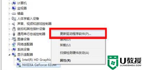 4、点击“显示适配器”,右键显示驱动,选中“更新驱动程序软件”;
