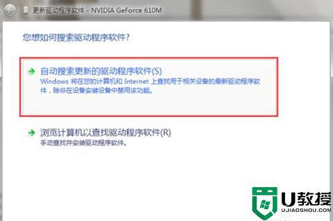 5、弹出选项,选择“自动搜索更新的驱动程序软件”;