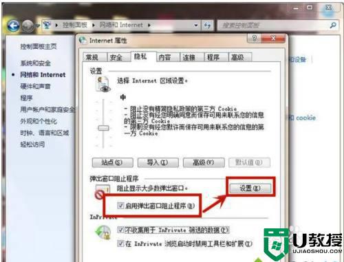 3、在打开的窗口中选择上方的“隐私”然后在隐私下方勾选“启用弹出窗口程序”再点击设置进入;