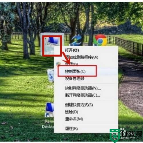 1、鼠标右键点击“计算机”在打开的菜单中点击“控制面板”进入;