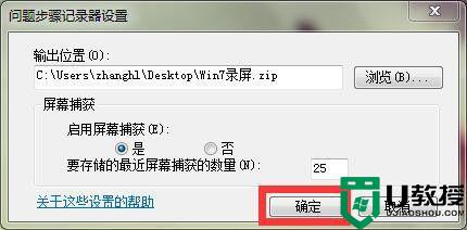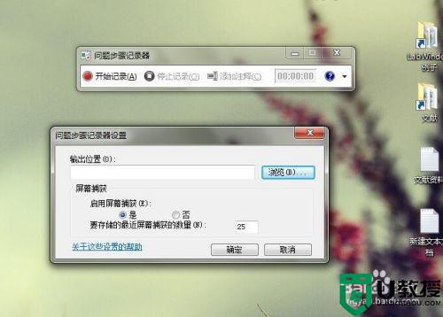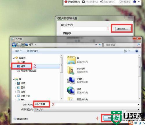 4、点击“浏览”,选择需要保存的位置(这里选择桌面),输入文件名(这里输入“Win7录屏”),点击“保存”。回到“问题步骤记录器设置”窗口,点击“确定”。