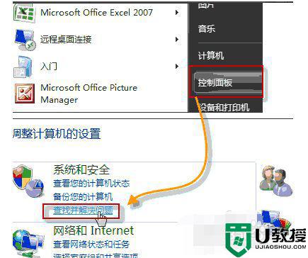 1、打开开始菜单,控制面板;在系统和安全中,选查找并解决问题。