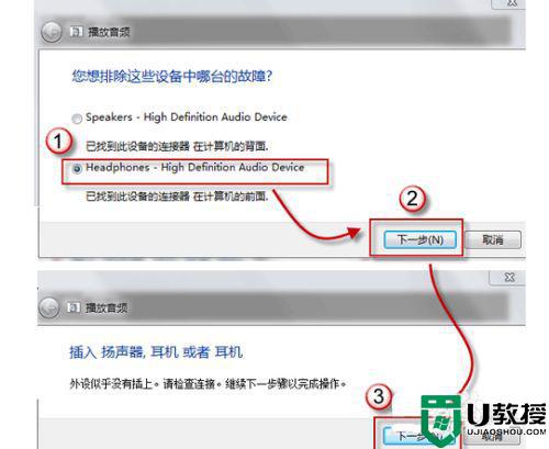 3、在故障对话框中,选择 Headphones,并点击下一步;此时,它会给出诊断信息:外设没有插上;并给出修复建议:插上扬声器或耳机。