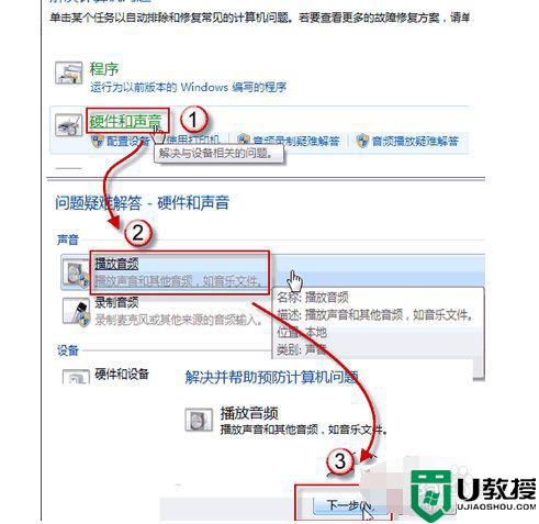 2、打开硬件和声音,在声音选项下,选择播放音频;在播放音频对话框中,点击下一步。