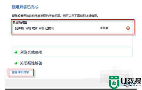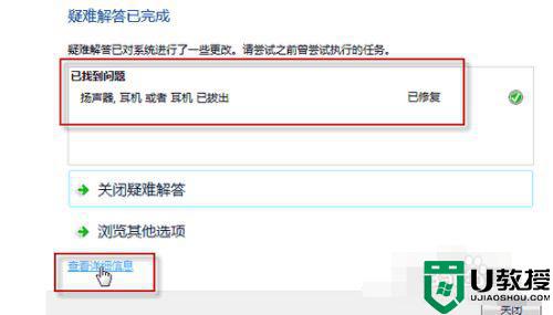 4、此时,如果插入耳机或扬声器,并点击下一步按钮,系统会自动更改修复,并给处如下对话框。