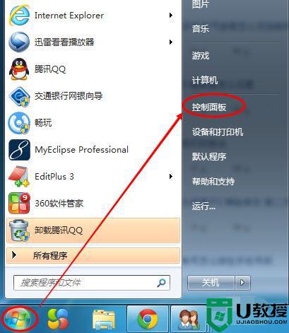 1、点击电脑左下角的“开始”,在弹出的开始菜单中选择“控制面板”打开。