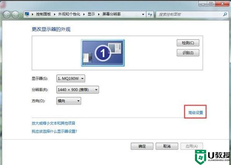2、在屏幕分辨率界面找到并选择“高级设置”。