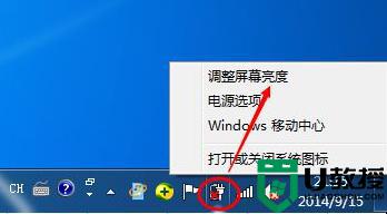3、也可以用鼠标右键电脑右下角的电源图标,在弹出的菜单中,点击“调整屏幕亮度”,如下图所示。两种方法都可以用。