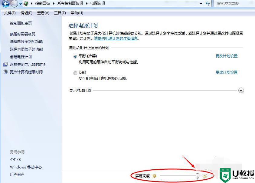4、在打开的电源选项窗口的最下面可以看到屏幕亮度调整的滚动条,直接拖动这里的滚动条就可以更改屏幕的亮度了。
