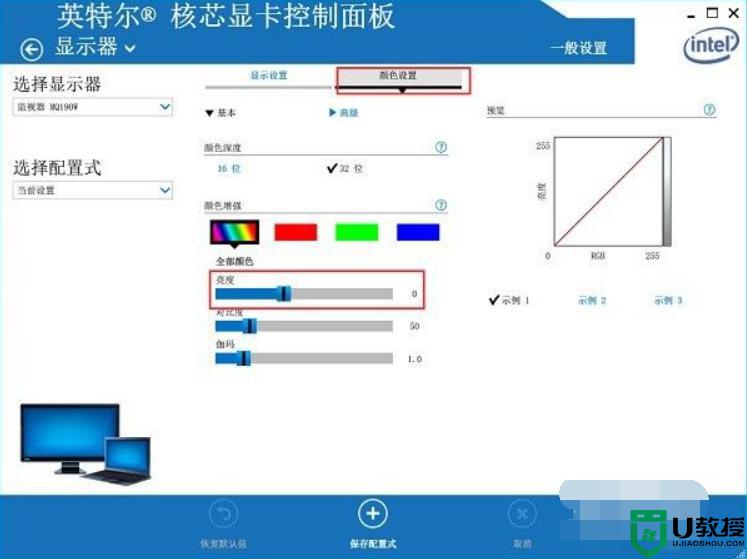5、打开显示器选项后,选择颜色设置,那么就可以看到屏幕亮度调节了。