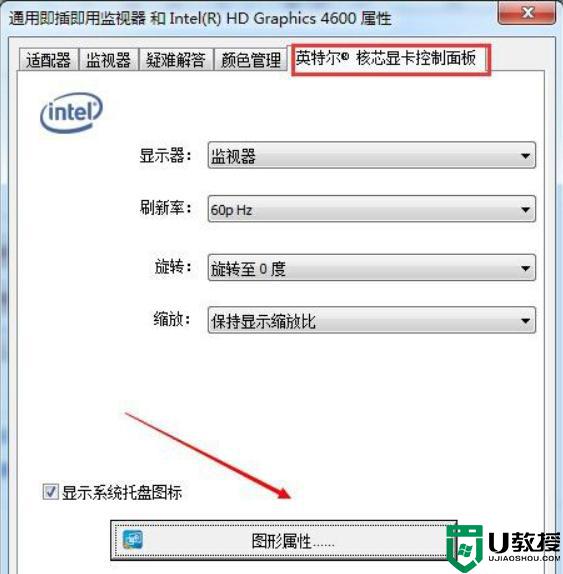3、打开高级设置后,根据不同显卡也会有不同的信息展示出来,此时,找到显卡控制面板选项,点击下面的“图形属性”。(注,如你的电脑打开高级设置没有这个界面,则可以尝试更新下显卡驱动试试。)