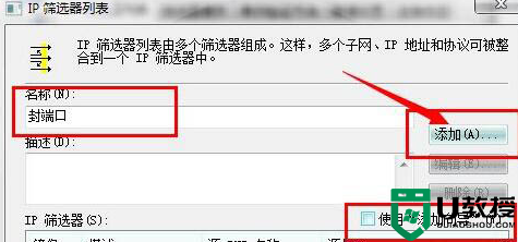 8、在ip筛选器列表中选择刚才添加的“封端口”,然后选择“筛选器操作”选项卡,,去掉“使用 添加向导”前面的勾,单击“添加”按钮