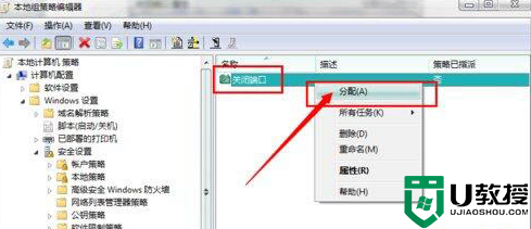 11、在组策略编辑器中,可以看到刚才新建的“关闭端口”规则,选中它并单击鼠标右键,选择“分配”选项,使该规则开始应用!