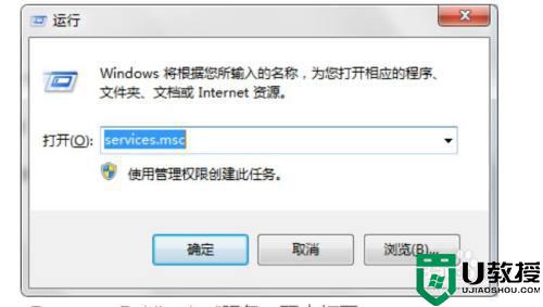 2、打开电脑的运行功能。之后输入“services.msc”,点击“确定”打开;