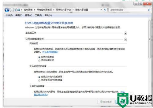 6、最后重新打开“控制面板”,依次选择“网络和共享中心”—“更改高级共享设置”,选择“启用网络发现”,点击“保存修改”就完成了。