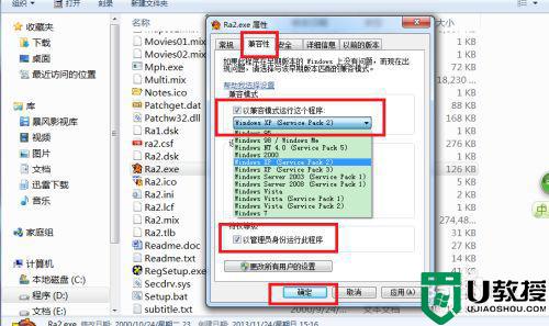 3、找到“兼容性”,勾选兼容模式,并选择“Windows Xp (Service Pack2)”,同时勾选“以管理员身份运行此程序”,点击确定。关闭所有窗口回到桌面。