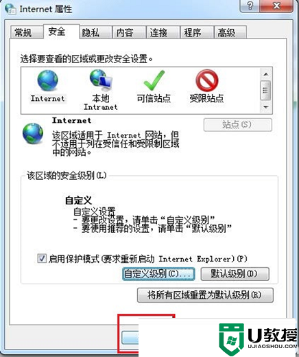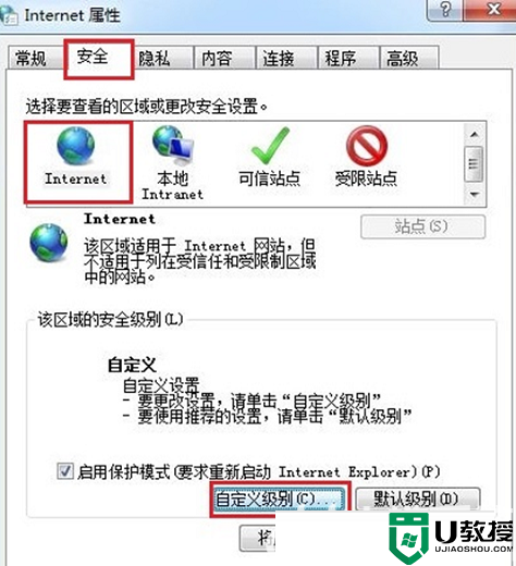3、随后选择“安全”下的“Internet”选项,最后点击“自定义级别”。