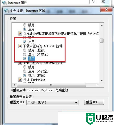 4、此时找到其中的“下载未签名的ActiveX控件”,将其中的“禁用”改为“提示”,最后点击“确定”即可。
