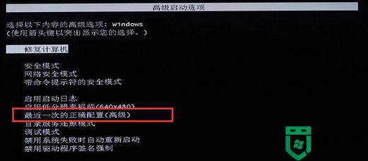 1、强制关机,按下开机键然后不停的敲击F8键,进入高级启动项,我们先选择最后一次正确配置,进行修复。
