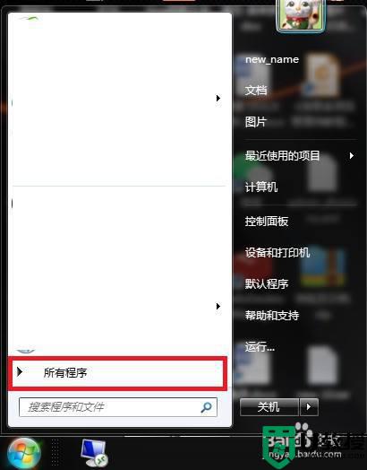1、打开电脑左下角开始菜单,在菜单列表中,选择【所有程序】,如下图所示。