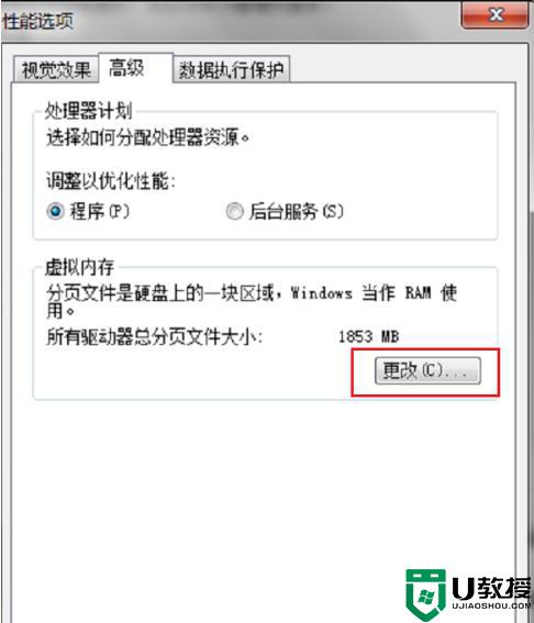 4、进去性能选项高级界面之后,点击虚拟内存下方的更改,如下图所示:
