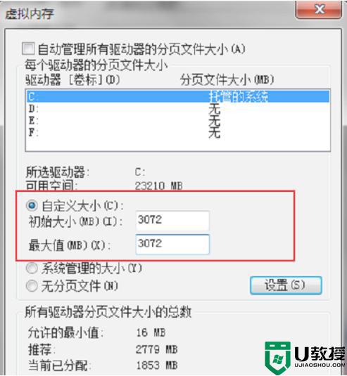 5、进去虚拟内存设置界面之后,选择自定义大小,虚拟内存设置大小一般为运行内存的1.5倍最好,初始大小和最大值都为1.5倍,这里电脑运行内存是2GB,虚拟内存就设置为3072MB,1GB=1024MB,如下图所示: