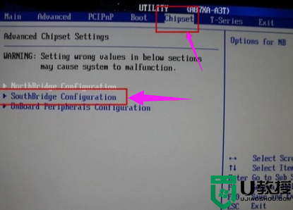2、按左箭头键进入Chinpset菜单,点击SouthBridge Configuration。