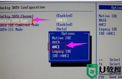 3、选择OnChip SATA Type,设置为AHCI,按F10键保存。