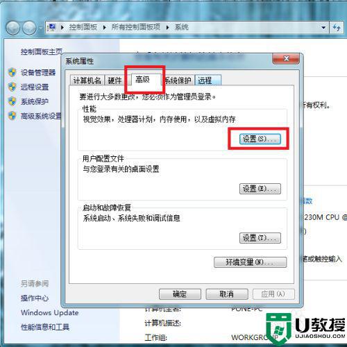 3、接下来,在打开的系统属性页面中,点击页面顶部“高级”选项卡,并点击第一个“设置”按钮。