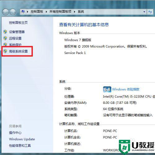 2、接下来,在打开的页面中,点击页面左侧“高级系统设置”选项。
