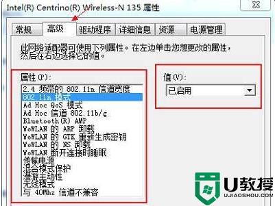 4、在弹出的属性对话框,切换至高级页签将802lln模式值选择为已启用即可。