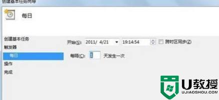 3、我们选任务执行时间,如果每天要定时关机可选择“每天”;要是每个星期中有几天不需要关机的可选择“星期”;至于“每月”不推荐选择,由于时间跨度太大,一般人用不到此功能,小编这选择的是“每天”;如图所示: