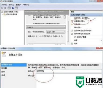 2、我们在右边的操作里选【创建基本任务】,也可以在【任务名称】里填写你想填的名字,小编在此填写的是“定时关机”;