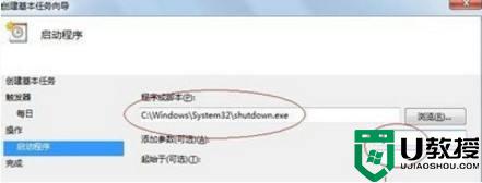 6、我们选择【启动程序】后输入:C:WindowsSystem32shutdown.exe,关键是要找到shutdown.exe,这根据个人安装系统的位置而定,可从浏览中找到;