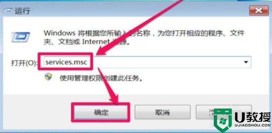 1、按下win+r快捷键打开运行菜单,输入services.msc回车确定,打开服务。