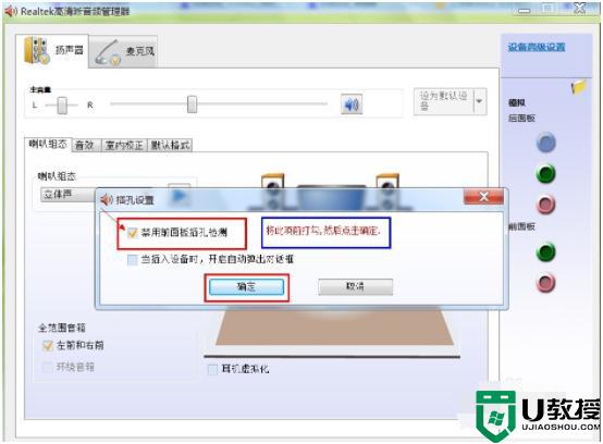 4、将【禁用前面面板插孔检测】前打勾,点击确定,这样消失的声音就回来了。