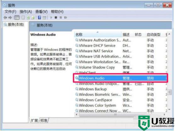 2、在服务列表中,打开Windows Audio这一项,即音频服务,双击打开其属性。