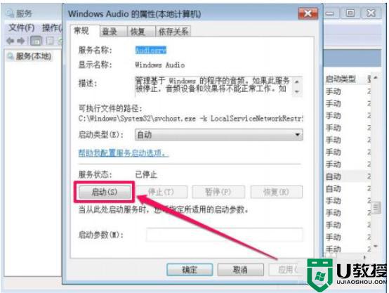 4、接着改好后先点击应用,再点击启用,等待启用完成,最后点击确定即可开启音频服务。