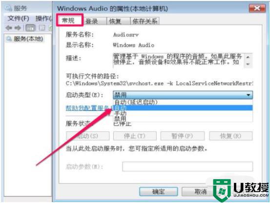 3、在音频属性窗口,选择“常规”选项卡,在其界面中,找到启动类型这一项,将其改为“自动”。