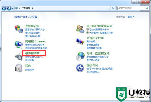 2弹出对话框,点击硬件和声音。
