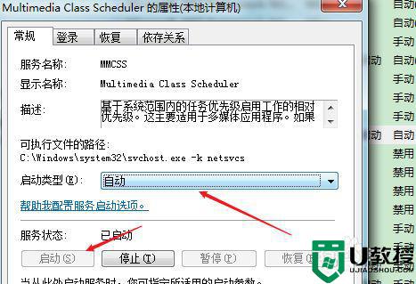5、在弹出的属性设置窗口中,在常规标签页下,将启动类型设置为“自动”,服务状态设置为“启动”,点击“确定”。