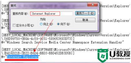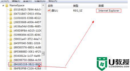 3、然后回到注册表编辑器,通过编号找到{B416D21B-3B22-B6D4-BBD3-BBD452DB3D5B}项,删除右侧数值数据为Internet Explorer的默认值即可解决桌面上ie图标删不掉的问题了。